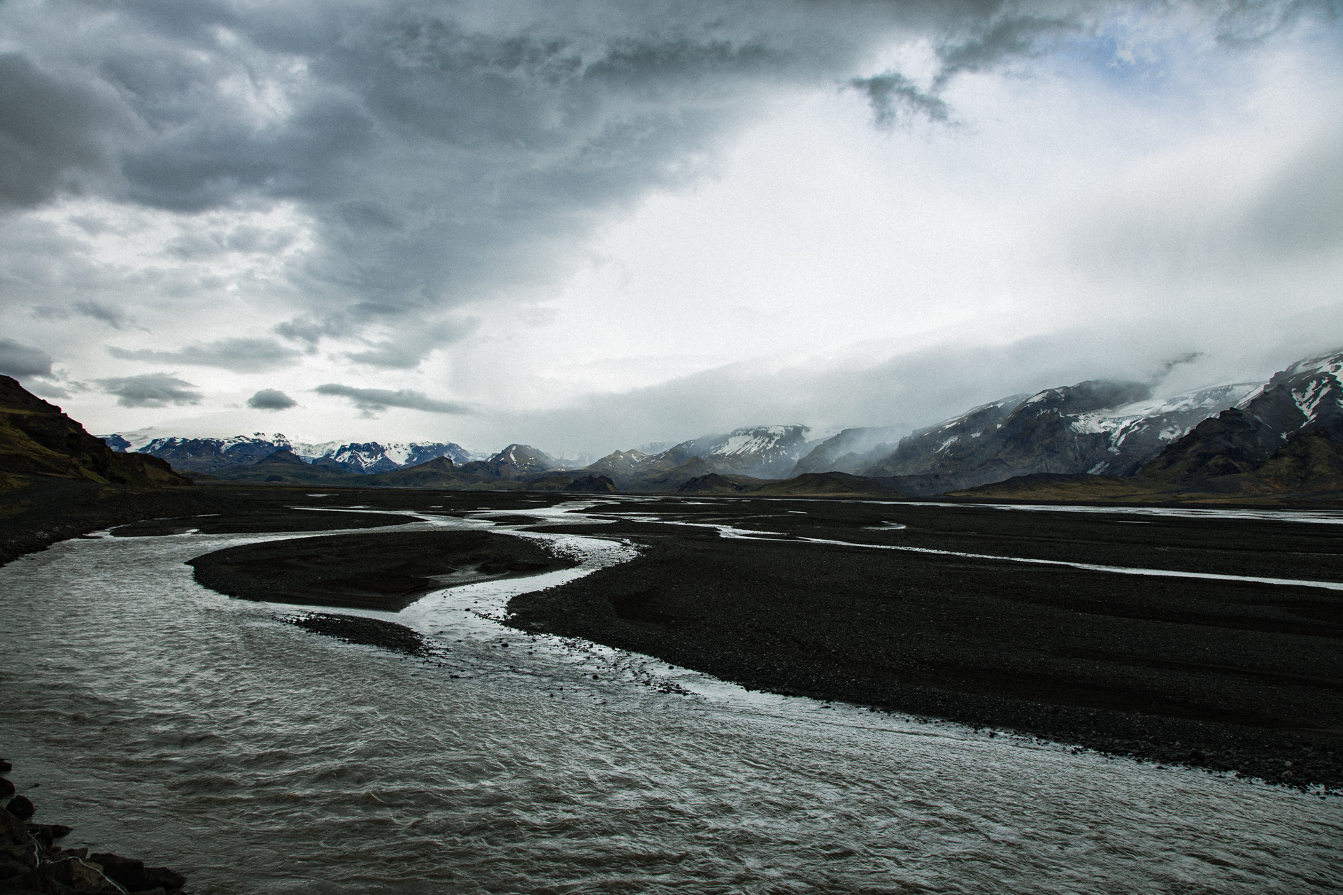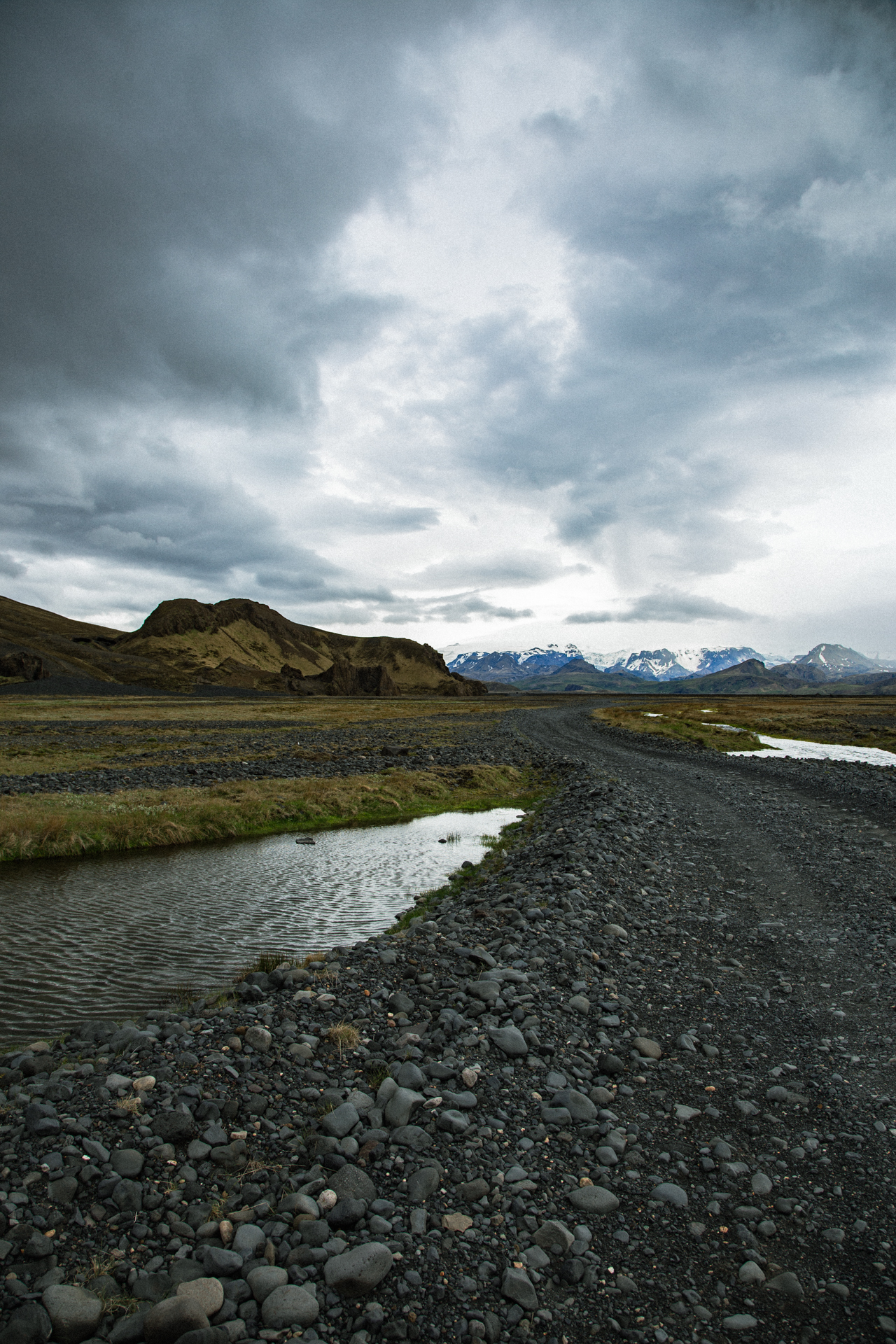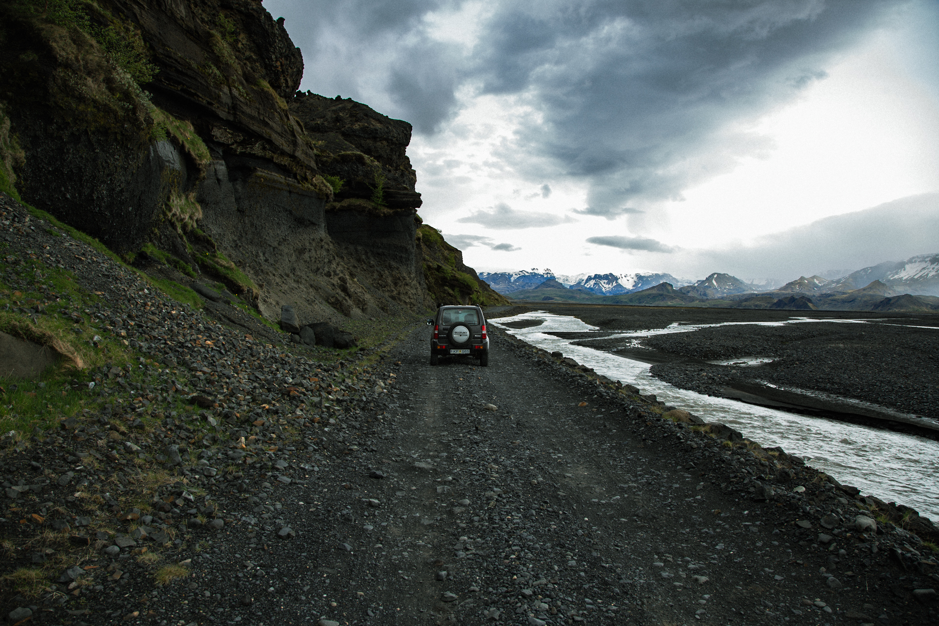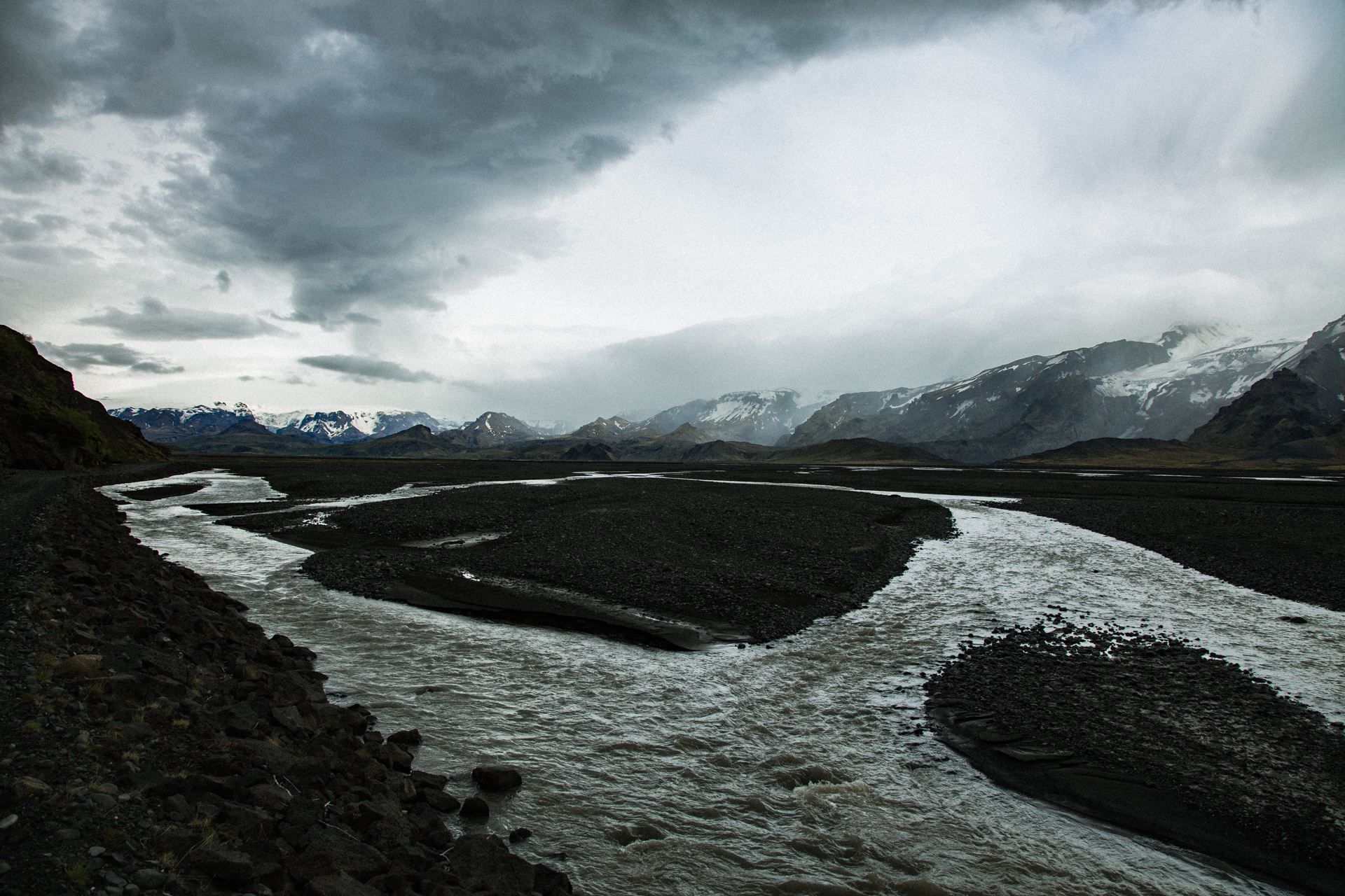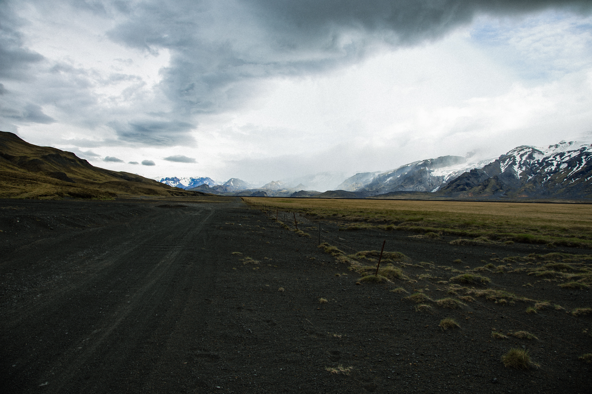 Wir fahren weiter. Über verschiedene Blogs hatte ich von den schönen Strecken nahe des Naturschutzparks „Þórsmörk“ – keine Ahnung wie das ausgesprochen wird – gelesen. Also war auch das auf dem Navi eingetragen. Wir fahren dafür ein wenig von der Ringstraße ab. Damit sind ganz automatisch deutlich weniger Autos unterwegs. Also noch weniger als ohnehin schon. Auf unsere linken haben wir eine grüne Anhöhe und leichte Berge. Auf der Rechten sehen wir ein sehr breites Flussbett, oder etwas das vor sehr langer Zeit mal eins war. Dahinter erstrecken sich mit Schnee bedeckte Gipfel. Einer davon war der 2010 ausgebrochene Vulkan mit einem noch weniger aussprechbaren Namen. Wir machen noch ein paar mehr Fotostopps. Irgendwann geht die geteerte Straße über in eine Schotterpiste. Aber immer noch in einem sehr sehr guten Zustand. Die Straße macht einen Knick. Wir fahren inzwischen die Schotterpiste komplett alleine auf der Straße. Auch wenn ab und an entfernt an dieser Straße noch Häuser liegen und man sich denkt: Die brauchen 4 Stunden um mal eben schnell Einkaufen zu fahren … Nun aber steht da ein Schild auf der Straße „Unpassierbar“. Links und rechts geht ein Fahrspur an dem Schild vorbei.