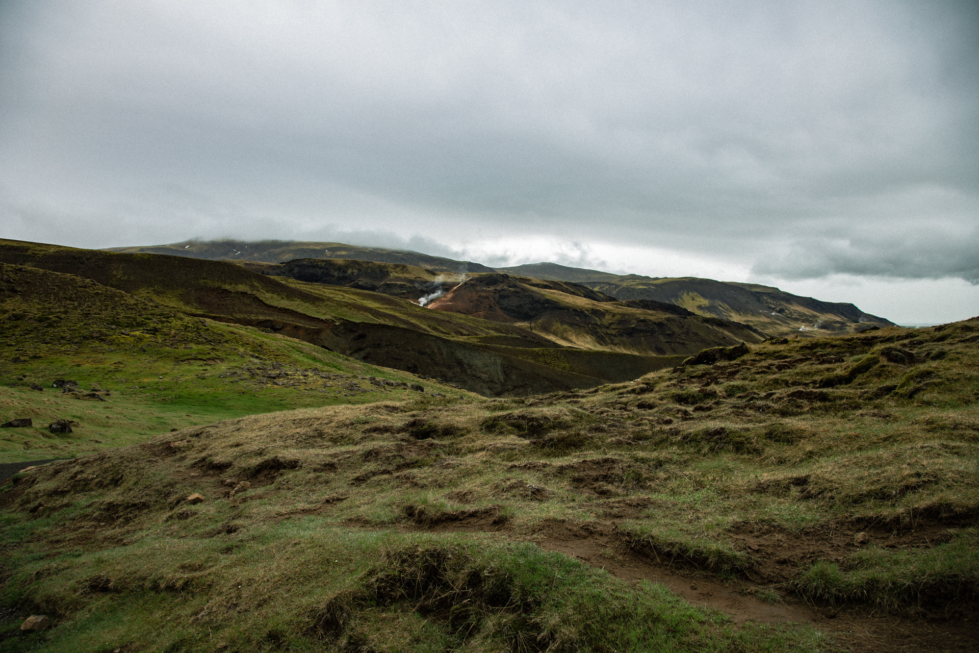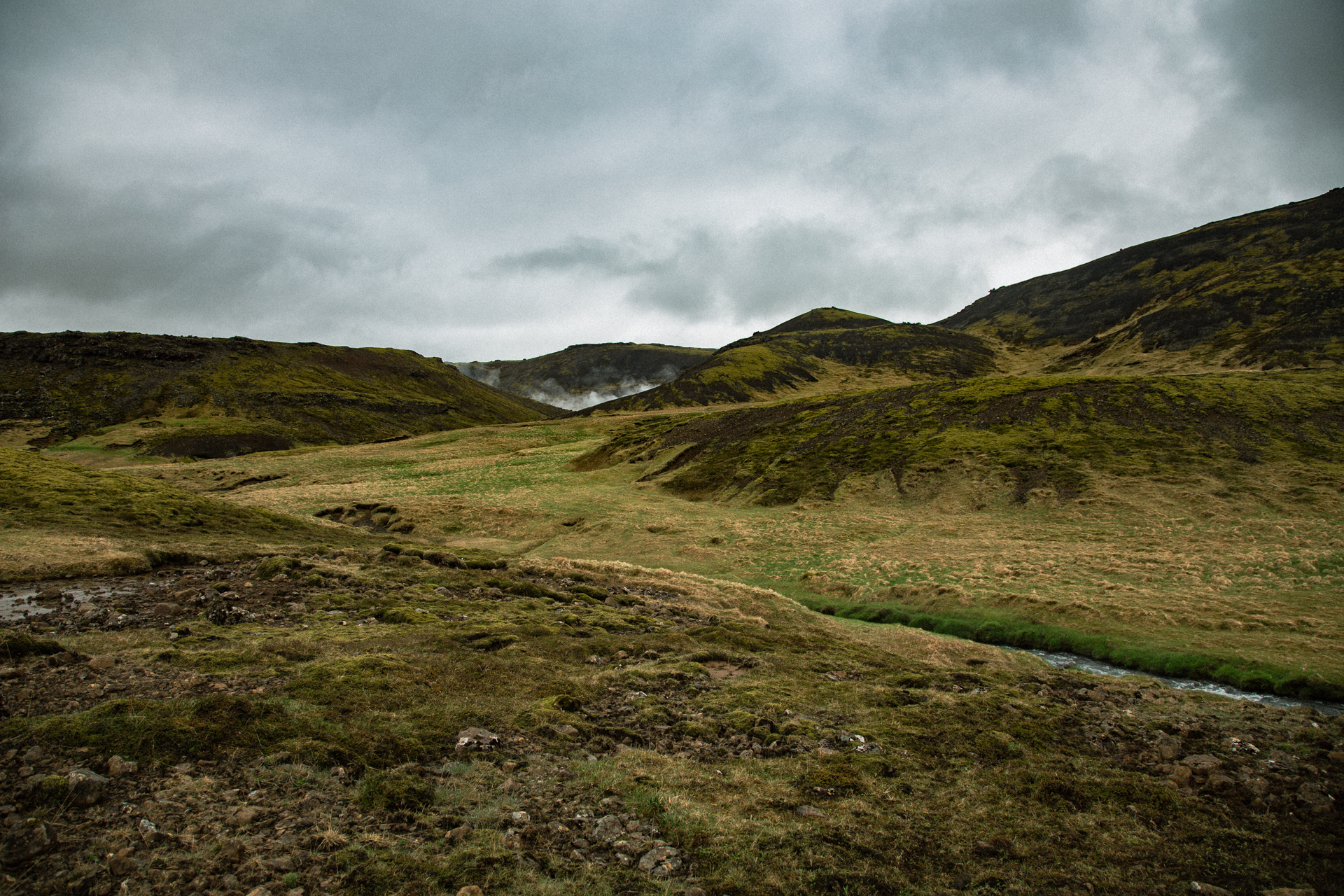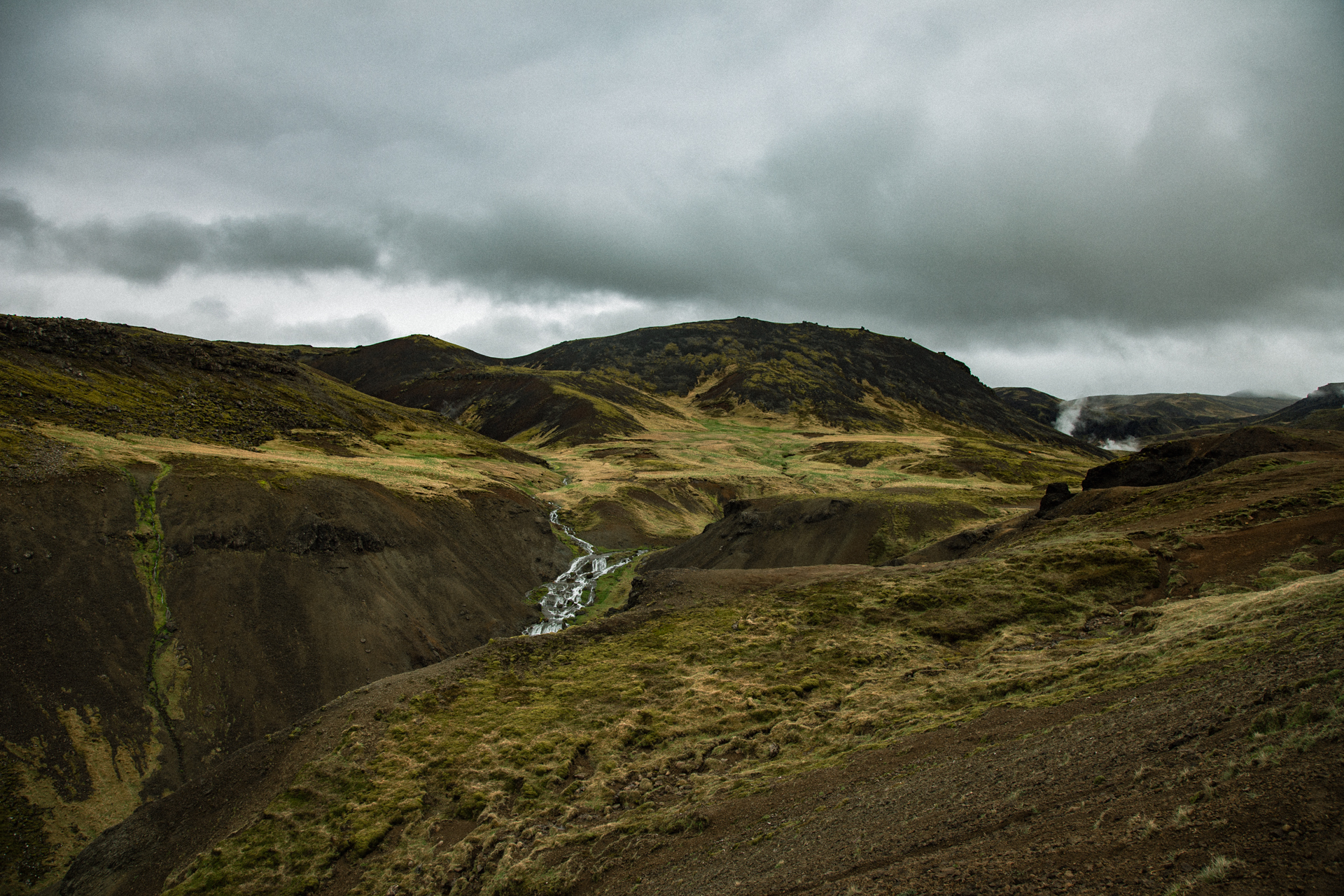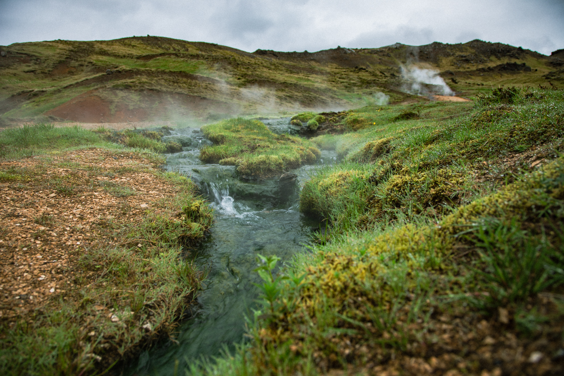 Vom Parkplatz aus sollen es drei Kilometer zu Fuss sein bis man an die heißen Quellen kommt. Gleich nach dem Parken und den ersten Metern den Berg hinauf kommt dir aber schon der Geruch von Schwefel entgegen. Alles Wasser das dir entgegenströmt ist mehr als Handwarm. In dem warmen Wasser schimmern die Algen. Aber es geht noch eine Kurve um den Berg und dann noch eine. Dann gibt es noch einen kleinen Wasserfall. Dann noch eine Kurve und noch eine. Wie viel Meter sollten es sein? Fast ganz oben angekommen gibt es eine keine Ponystation. Ein paar Pferde sind eingepfercht während ihre Besitzer im Wasser baden gehen. Das war der erste wirkliche tolle Eindruck von Island was Berge, Wasserfälle und heiße Quellen angeht.