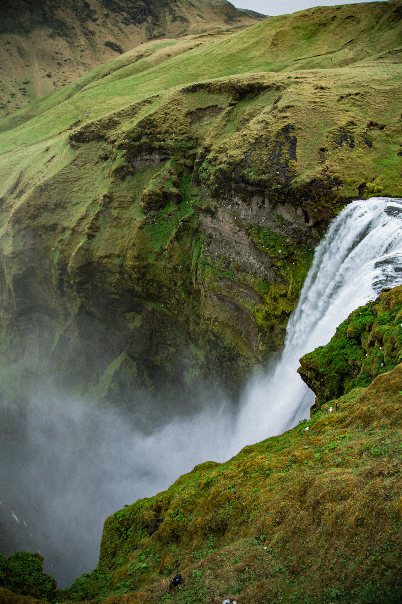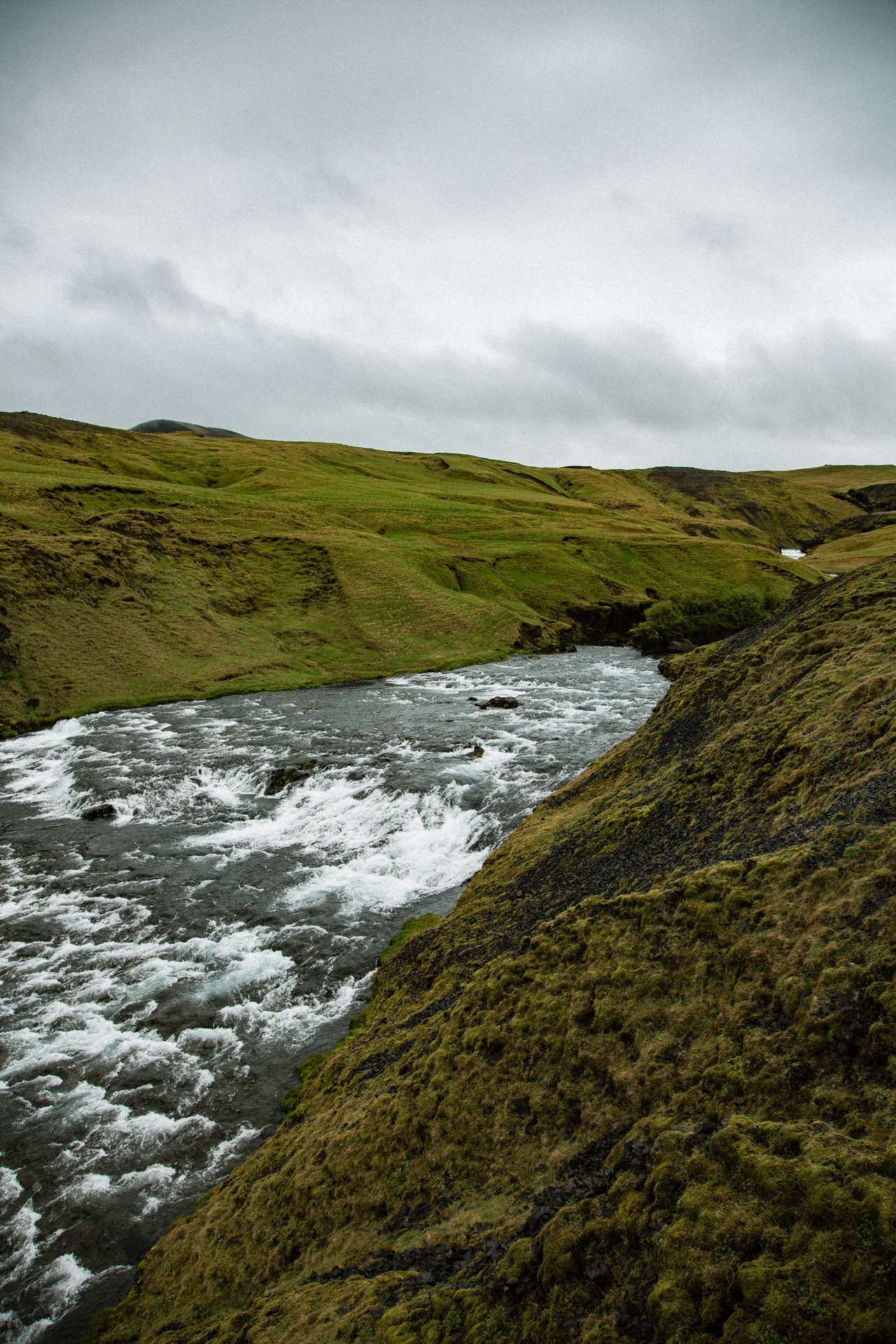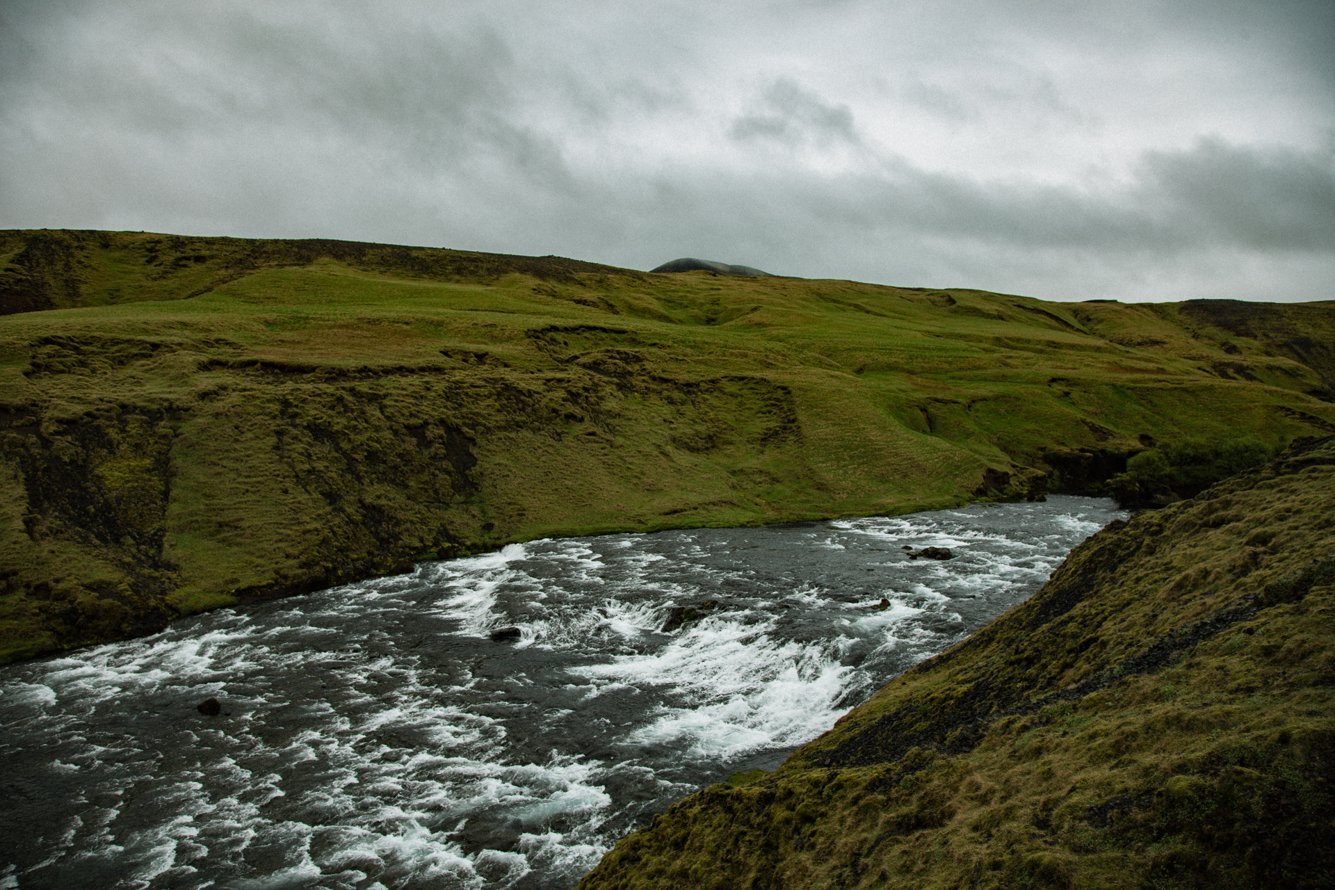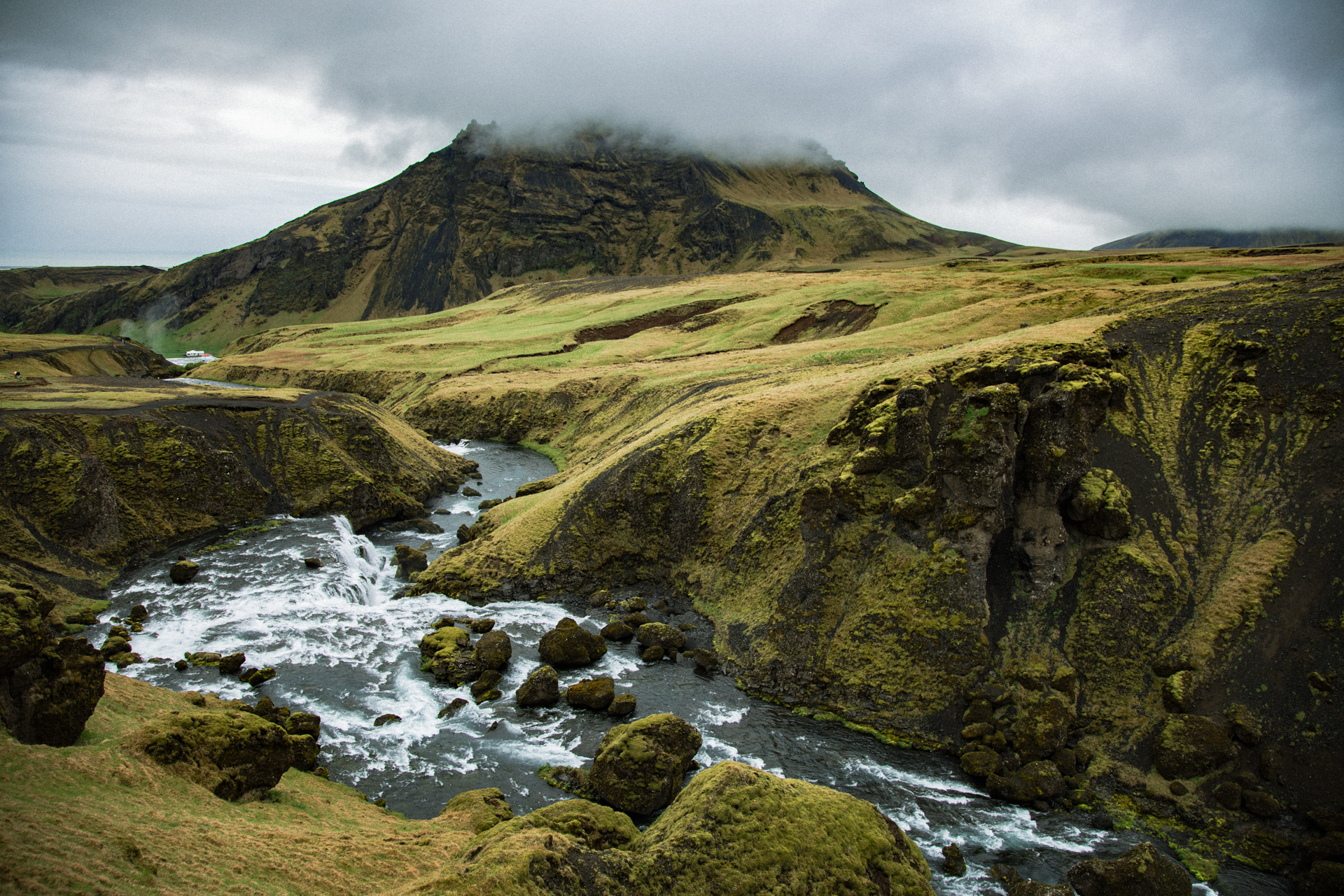 Skógafoss ist ebenfalls ein Wasserfall. Noch eine kleine Nummer größer. Und mit einem Aussichtspunkt an der oberen Kante. Wir klettern also die etwas mehr als 62 Meter die der Wasserfall hoch ist. Unter bekommt man leider wieder kein richtig tollen Bild, also eines auf dem keine Touristen drauf zu sehen wären. Oben ist schon deutlich weniger los. Den Aufstieg halten wohl wenige für lohnenswert. Irrtum. Das eigentlich tolle daran ist der Weg, der den Fluss bis zu dem Wasserfall entlangführt. 24 weitere kleine Wasserfälle soll es hier geben. Und tatsächlich schlängelt sich der Fluss über Stock und Stein durch die Landschaft. Und ein Abschnitt ist schöne und unberührter als der nächste. Zwei kleine Wasserfälle später hört auch der schöne Geröllweg auf, den man für die Touristen geschüttet hat. Über bleibt nur noch eine kleiner Trampelpfad. Und hier gibt es tolle Ecken! Es lohnt sich. Wirklich!