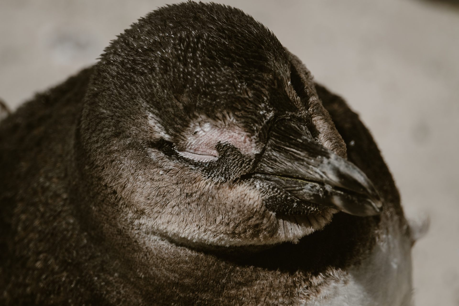 Vom Parkplatz geht es einen Holzsteg entlang. Der Weg ist zu den Seiten abgesperrt. Denn hier sitzen schon die Pinguine in den Büschen. Ein paar Jungtiere, aber vor allem die bereits älteren Tiere, die gerade ein neues Federkleid bekommen. Einmal im Jahr bekommen die Pinguine ein neues Federkleid. Dann ist für ca. drei Wochen Fasten angesagt, weil sich damit schlecht Schwimmen lässt. Solange verstecken sich die Tiere dann gerne in den Büschen, bis alle neuen Federn wieder da sind.