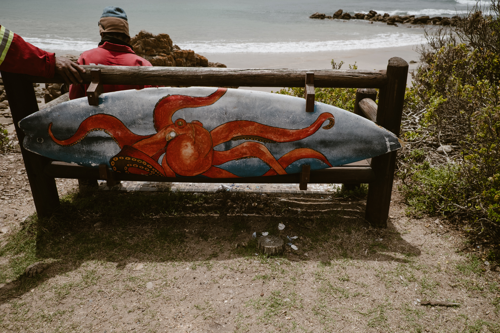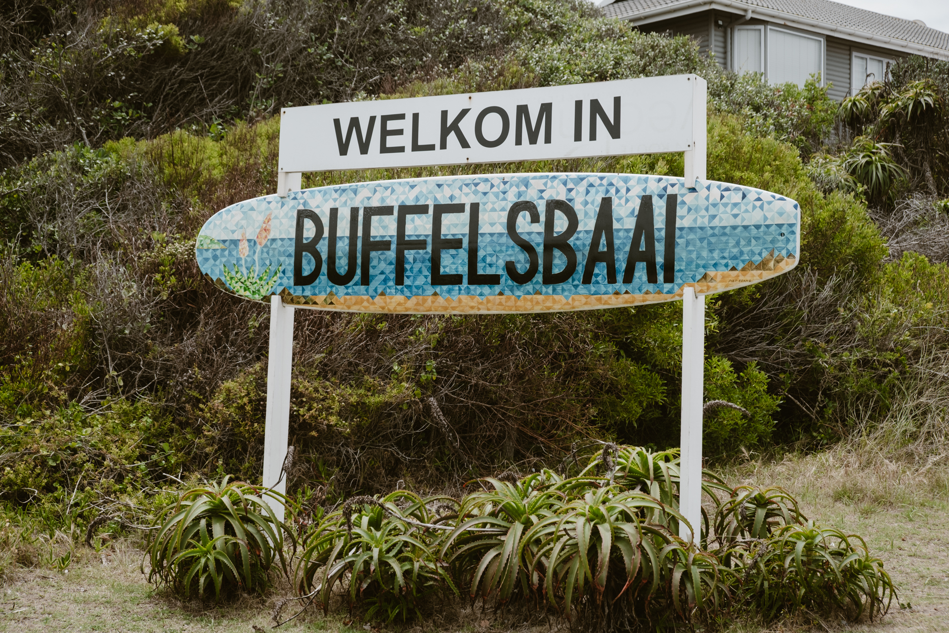 Daher machen wir noch einen kleinen ersten Abstecher nach Buffels Bay. Ein kleines Surfer Örtchen auf der anderen Seite der Bucht von Brenton. Von hier am Strand können wir also schon Brenton auf der anderen Seite der Bucht sehen. Der Ort hier sieht aber auch schon echt süß aus. Es gibt viele kleine nette Häuschen auf einem kleinen Hügel an der Küste. Am Strand sind in der Tat ein paar Surfer im Wasser. Entlang der kleinen Straße am Wasser stehen überall bemalte Surfboards als kleine Kunstausstellung am Strand.