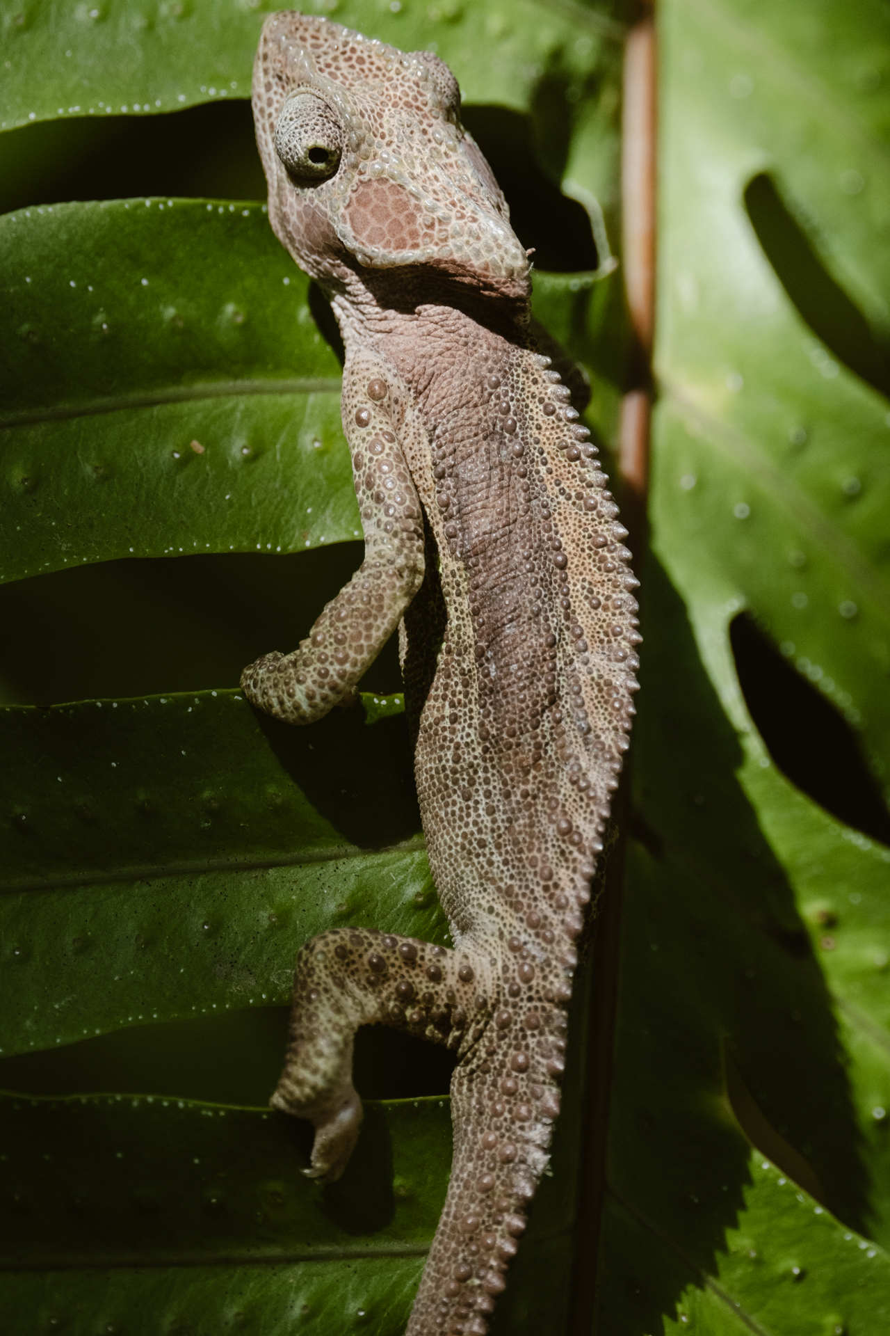Meine Kamera liegt auf dem Tisch. Das Kind hopst durch die Gegend. Da spricht mich ein Touristen Guide an, der hier scheinbar gerade eine kleine Führung beendet hatte und zwei seiner weißen Touristen abgesetzt hatte: „Papa, come with Camera“, und zeigte in die Büsche. Da saß ein Chameleon. Fand ich natürlich super nett, dass er mich darauf hingewiesen hat. Er würde eben auch viel fotografieren. Aber eigentlich macht er eben lokale Touren, z.B. durchs Township. Von da oben könne man tolle Fotos machen – also gleich noch ein bisschen Sales für seine Touren betreiben. Aber ich glaube auch wirklich, dass er mich primär wegen der Kamera angesprochen hat und das noch gar nicht so als purer Verkauf gemeint war. Wobei das ja aber auch Hand in Hand geht. Die beiden die er hier abgesetzt hatte waren auch Deutsche.