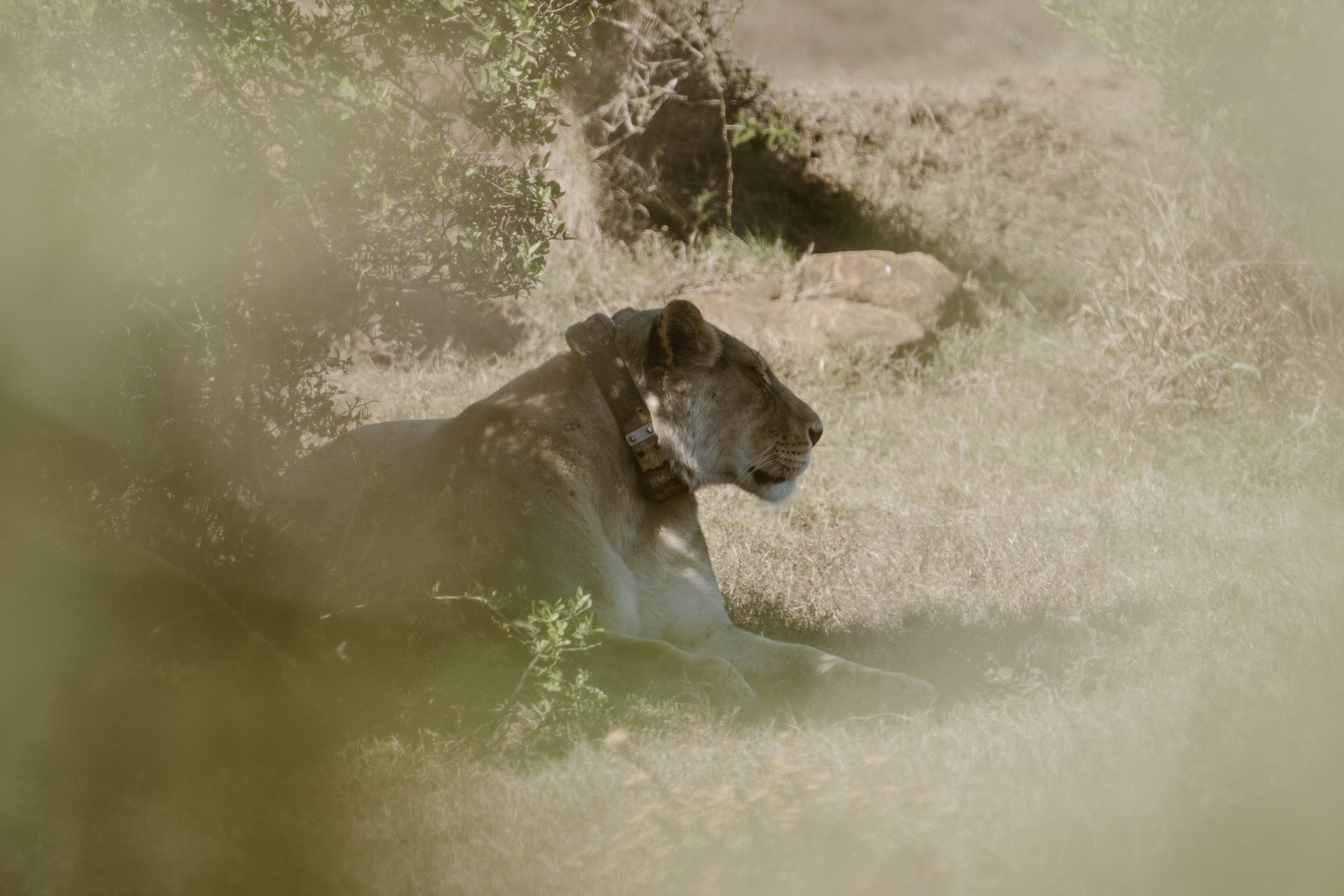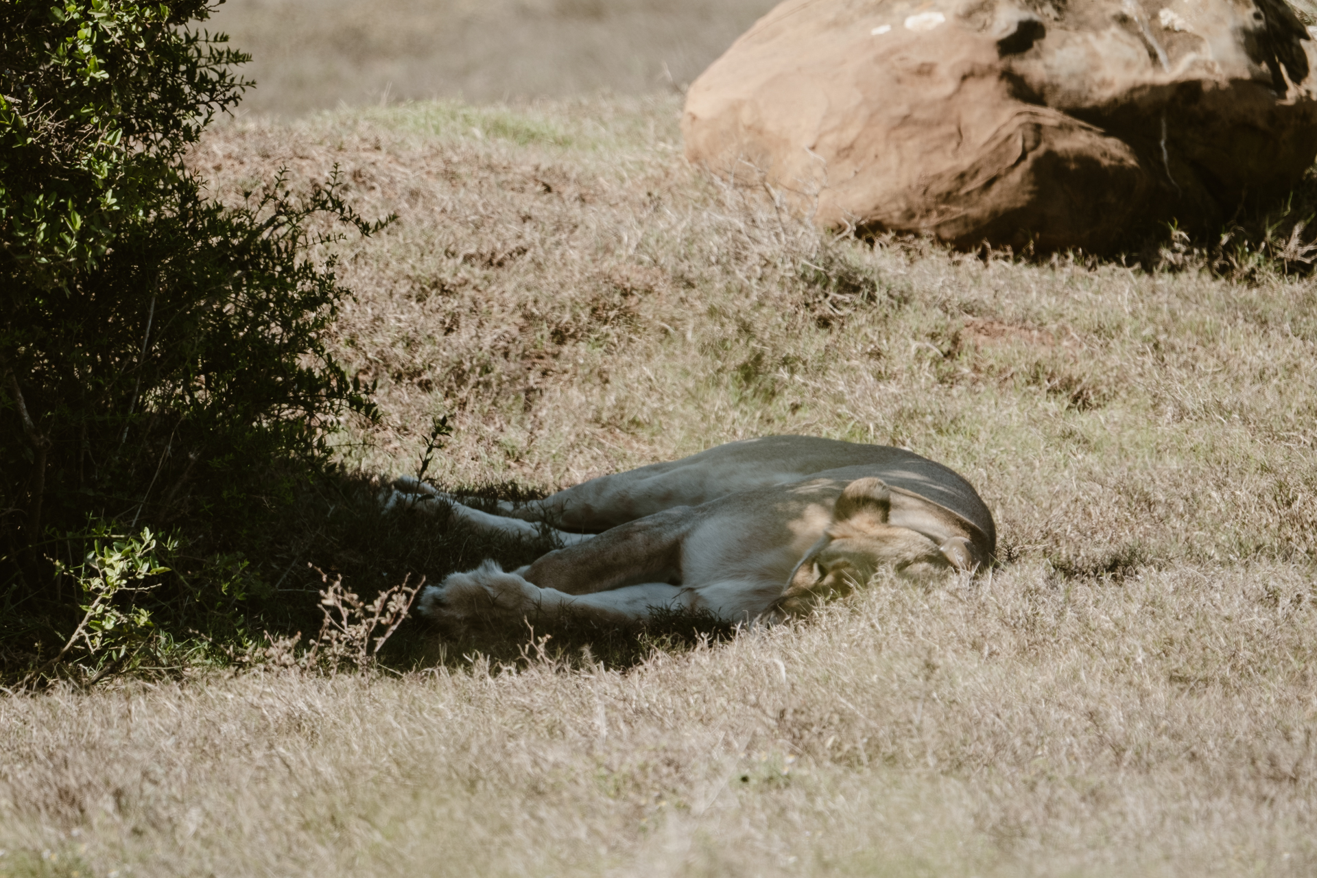 Irgendwann halten wir an einem Wasserloch mit einem Wasserbüffel. Vor uns steht eine geführte Tour. Ich hänge mit dem Teleobjektiv aus dem Fenster, als der Wagen an uns vorbeifährt und kurz hält. Wir müssten die nächste Straße den Berg rauf und dann links. Da wäre gerade ein Löwe gesichtet worden. Wir düsen also los. Und tatsächlich sehen wir dann schon die anderen Wagen dort stehen. Die müssen so eine Ranger-WhatsApp Gruppe haben, wo gerade welche der ausgefallenen Tiere gesichtet wurde. Und dort liegt dann im Schatten auch eine große Löwin und wir bekommen noch ein paar gute Bilder. Irgendwann wird ihr das aber auch zu viel. Sie steht auf und reist durch die Büsche ab.