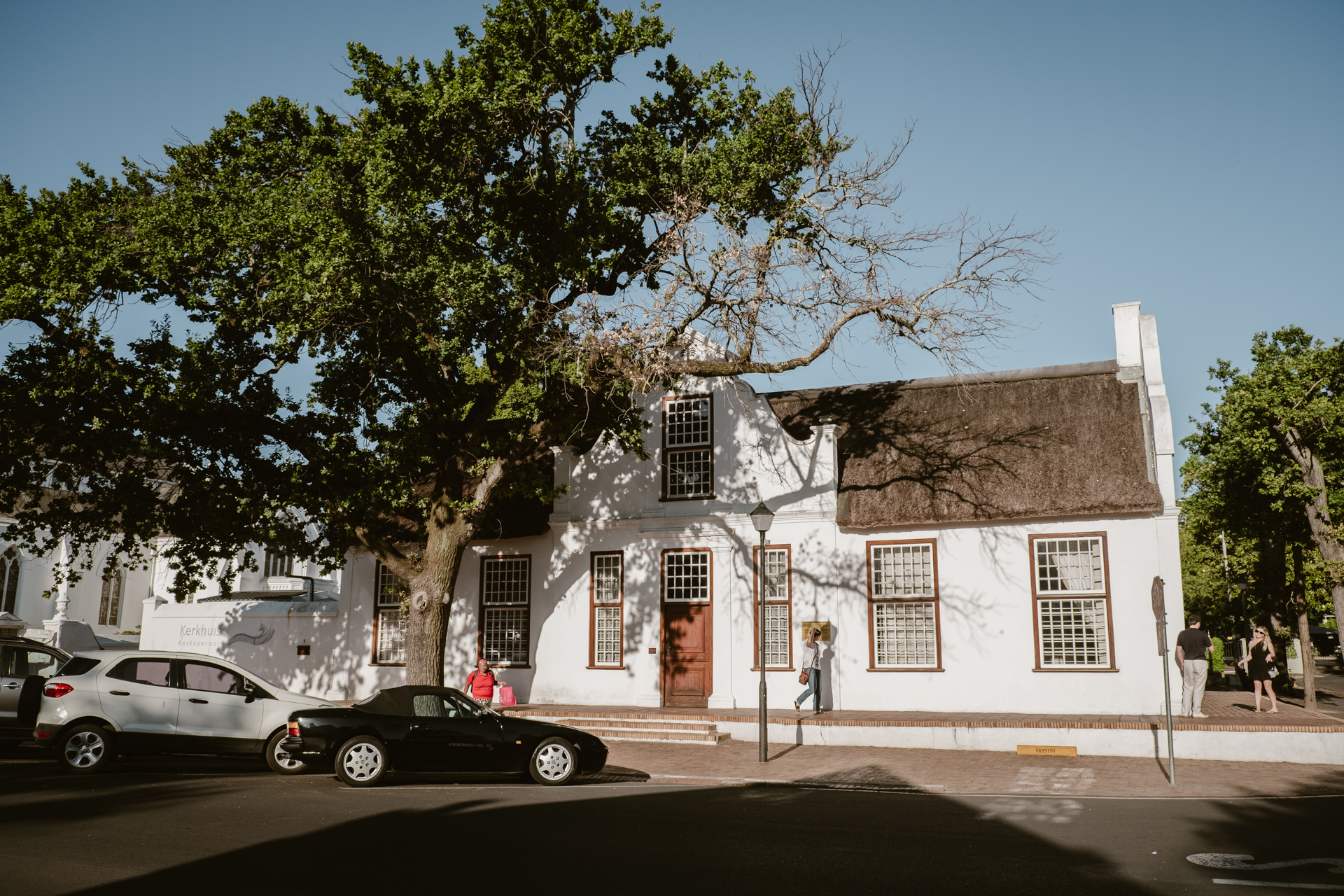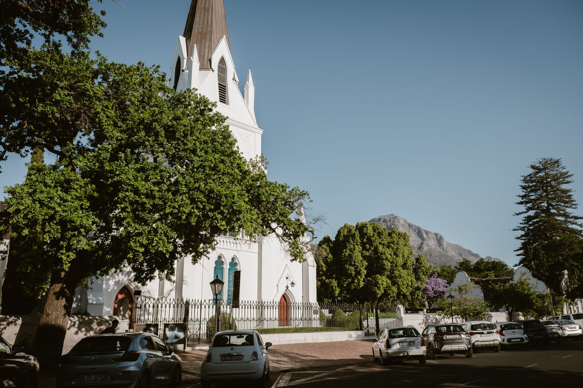Stellenbosch selber ist auch ein wirklich schönes Städtchen. Alles sauber, weiß. Damit meine ich vor allem auch die Häuser. Aber am Ende sind es auch wieder die Menschen. Alles ist hübsch, gepflegt und sieht toll aus. Dann gibt es die Kunstgalerie in der heute Empfang ist und weiße Menschen mit Champagnerglas in der Hand stehen vor der Tür. Du möchtest dich hier in jedem zweiten Laden hineinsetzen, weil es so schön und nett aussieht, auch wenn zumindest von außen Franschhoek noch eines drauf legt.
